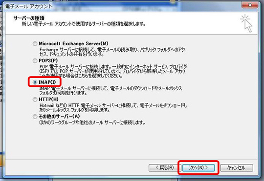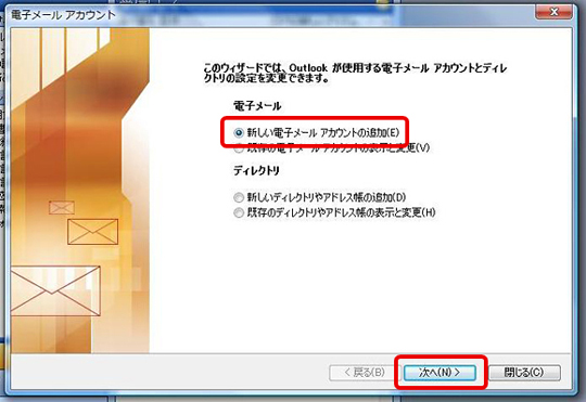 (2)「電子メール」の「新しい電子メールアカウントの追加」を選択し「次へ」